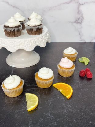 Two four packs of Marie Antoinette's Assorted Vegan Cupcakes. (Gluten free, dairy-free and egg-free cake infused with flavored lemon, orange, raspberry and key lime oils and topped with flavored icing), and one four-pack of Marie Antoinette's Chocolate Vegan Cupcakes. (Gluten free, dairy-free and egg-free chocolate cake vanilla icing.)